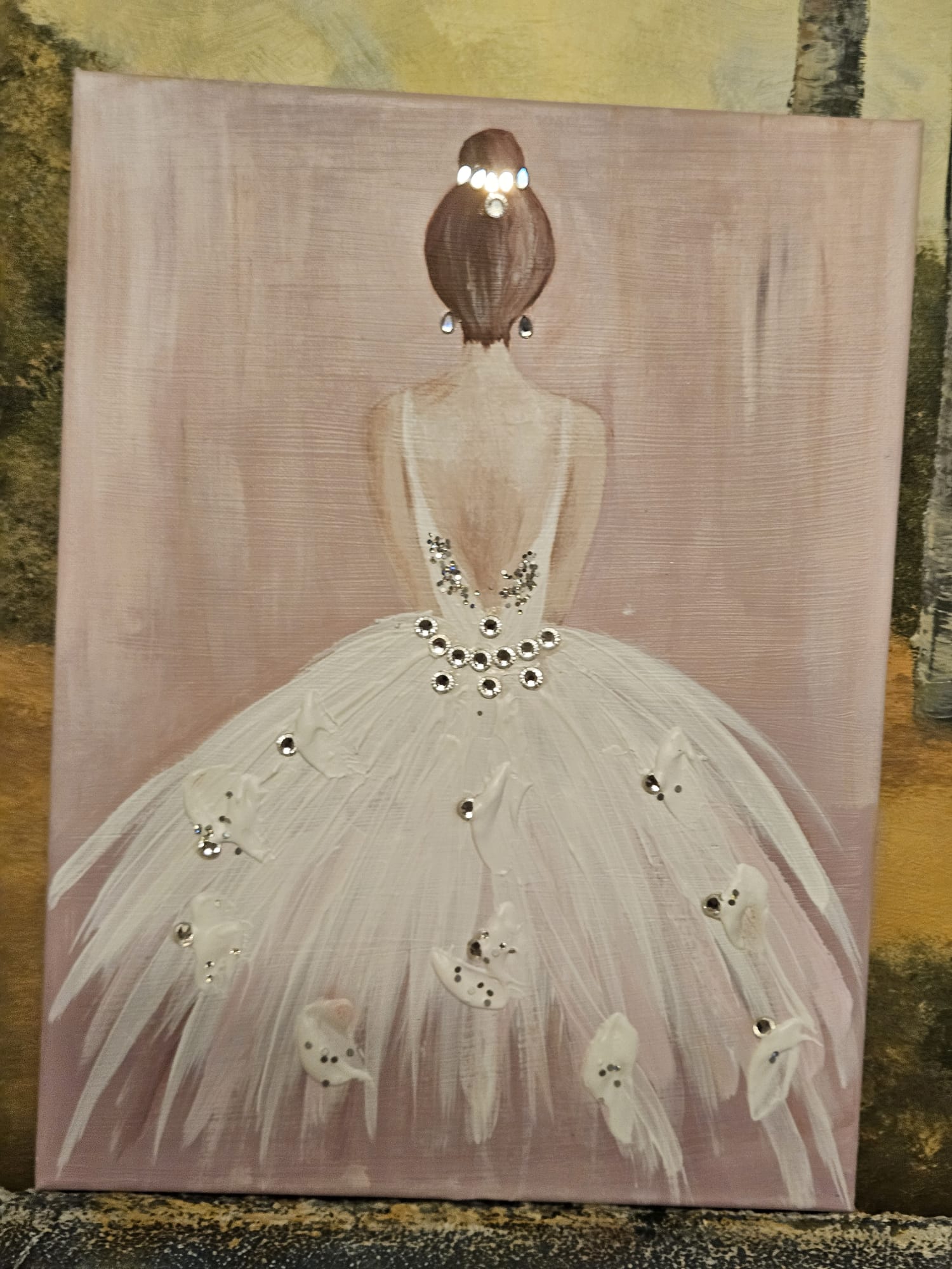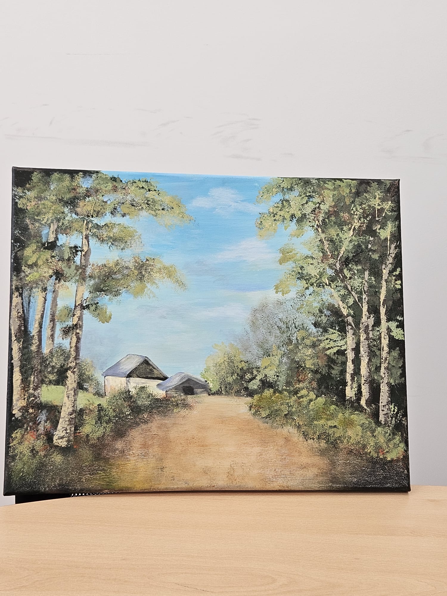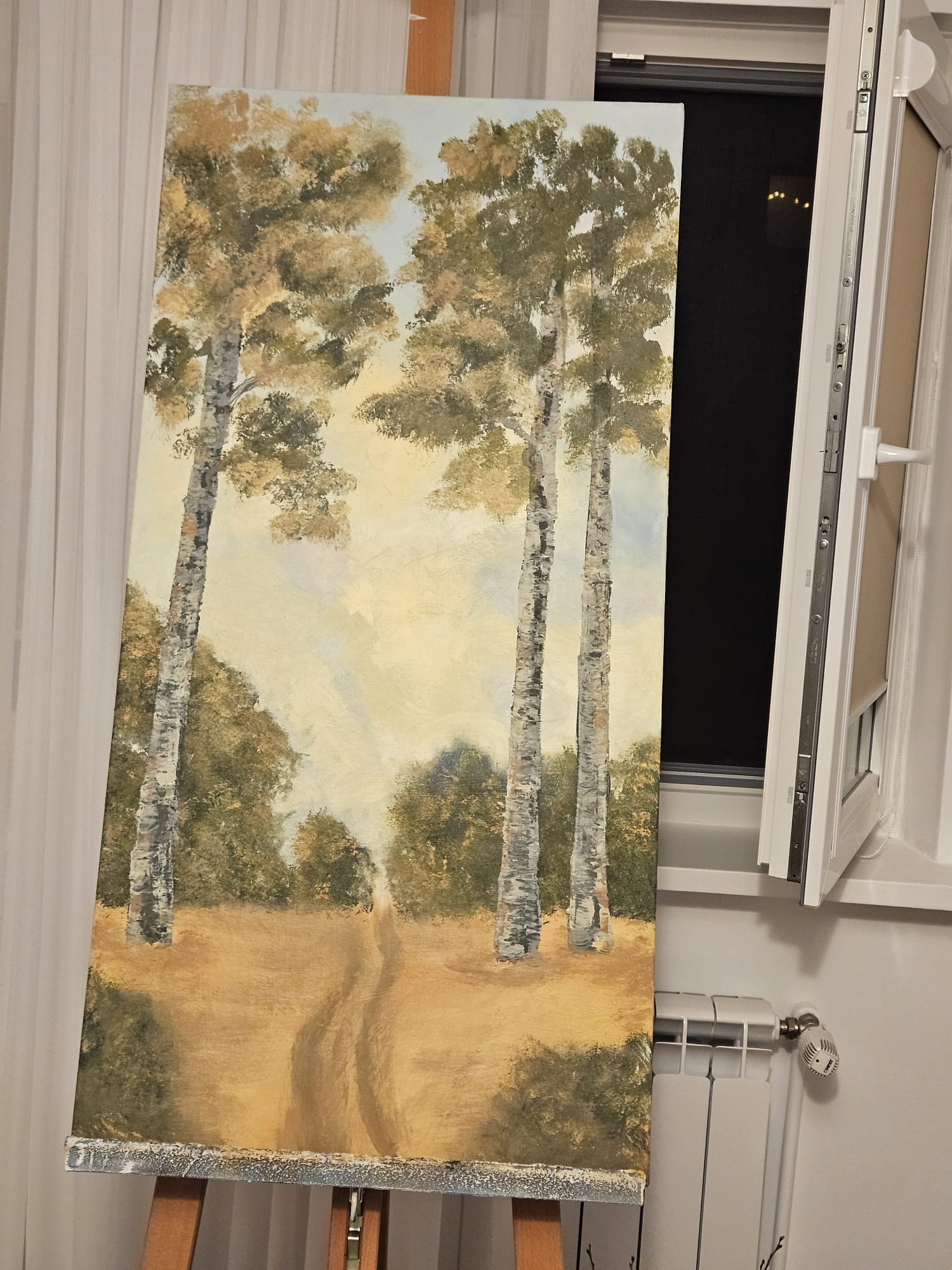Un peisaj de iarnă ca din povești, în care o căsuță cu acoperiș înzăpezit strălucește discret la lumina caldă a apusului, ferestrele ei galben-aurii aprinse ca niște felinare în mijlocul pustietății albe. Copacii desfrunziți își întind ramurile delicate spre cerul în tonuri de piersică și crem, iar poteca acoperită de zăpadă reflectă lumina blândă a serii, ca o oglindă caldă ce duce privirea spre adăpostul familiei. Contrastul dintre răceala iernii și căldura luminii interioare creează acea emoție profundă a întoarcerii acasă. Ajuns în noua sa casă, tabloul a găsit un admirator neașteptat: micuțul Luca, care îl privește cu ochișori mari la fiecare schimbare de scutec, fascinat de luminițele calde din ferestre. O pictură care îi veghează primele descoperiri și care, poate, va rămâne una dintre cele mai vechi amintiri vizuale ale lui.